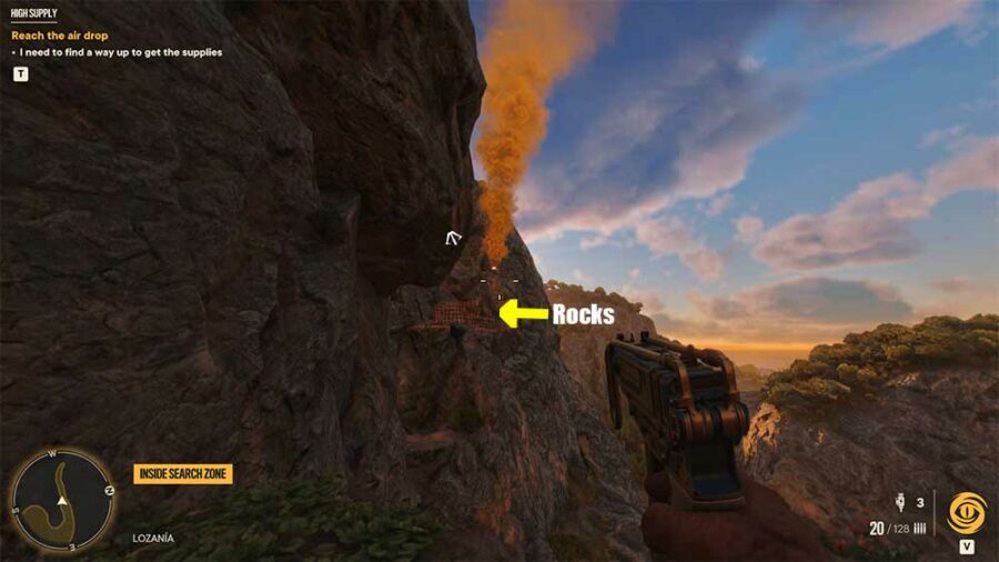 - Finally, throw any explosive to remove the rocks blocking your access to the supply drop.